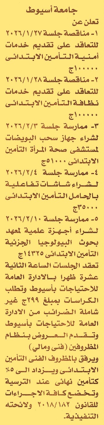HOT Information مناقصة عامة لعملية تقديم خدمات الأمن عن جريدة الأخبار Post navigation الهيئة العامة للرعاية الصحية فرع جنوب سيناء جامعة جنوب الوادي الأهلية بقنا