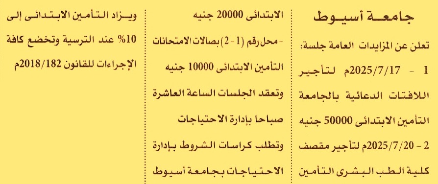 HOT Information مزايدة عامة لعملية تأجير اللافتات الدعائية بالجامعة عن جريدة الأهرام Post navigation الشركة المصرية للمطارات مركز شباب عرب العيايدة