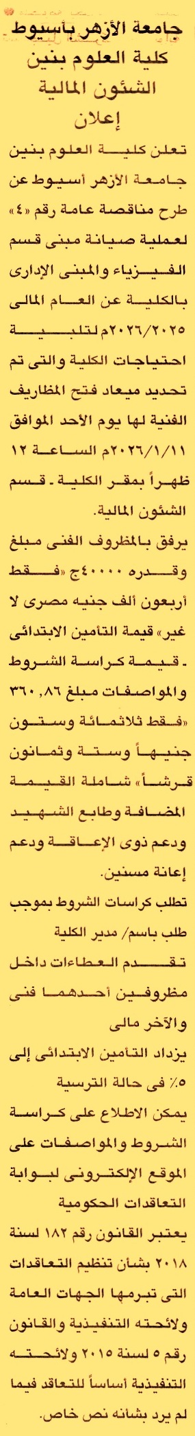HOT information مناقصة عامة رقم 4/2025/2026 لعملية صيانة مبنى قسم الفيزياء والمبنى الإداري بالكلية عن جريدة الجمهورية Post navigation الوحدة المحلية لمدينة سفاجا شركة الغازات البترولية