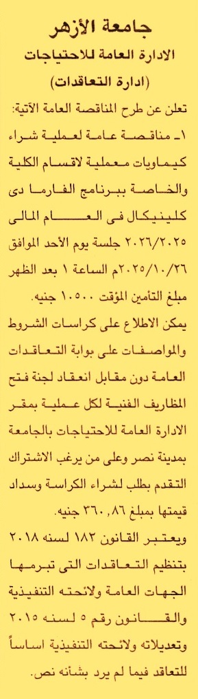 HOT information مناقصة عامة لعملية توريد كيماويات معملية لأقسام الكلية والخاصة ببرنامج الفارما دي كلينيكال في العام المالي 2025/2026 عن جريدة الجمهورية Post navigation نادي الترسانة الرياضي محافظة الغربية