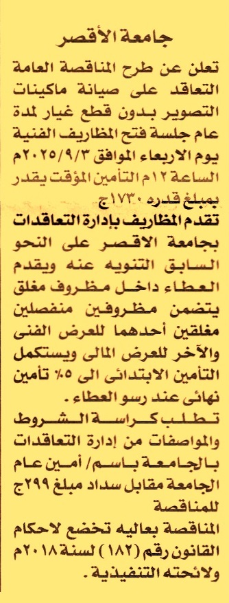 HOT Information مناقصة عامة لعملية التعاقد على صيانة ماكينات التصوير بدون قطع غيار لمدة عام (جلسة الاستفسارات يوم 4/8/2025) عن جريدة الأخبار Post navigation شركة السهام البترولية شركة النيل للمجمعات الاستهلاكية