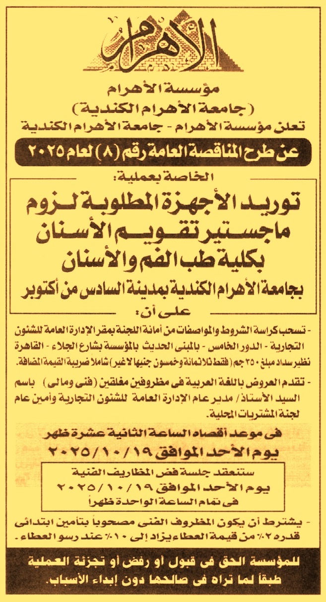 HOT Information مناقصة عامة رقم 8/2025 لعملية توريد الأجهزة الطلوبة لزوم ماجستير تقويم الأسنان بكلية طب الفم والأسنان بالجامعة (للمؤسسة الحق في قبول أو رفض أو تجزئة العملية دون إبداء الأسباب) عن جريدة الأهرام Post navigation مؤسسة مصر الخير بنك القاهرة