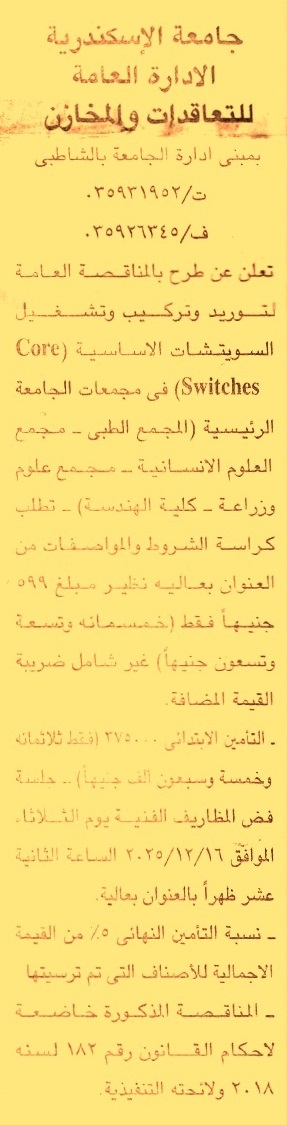 HOT Information مناقصة عامة لعملية توريد وتركيب وتشغيل السويتشات الأساسية Core Switches في مجمعات الجامعة الرئيسية “المجمع الطبي – مجمع العلوم الإنسانية – مجمع علوم وزراعة – كلية الهندسة” عن جريدة الجمهورية Post navigation جامعة القاهرة محافظة الغربية