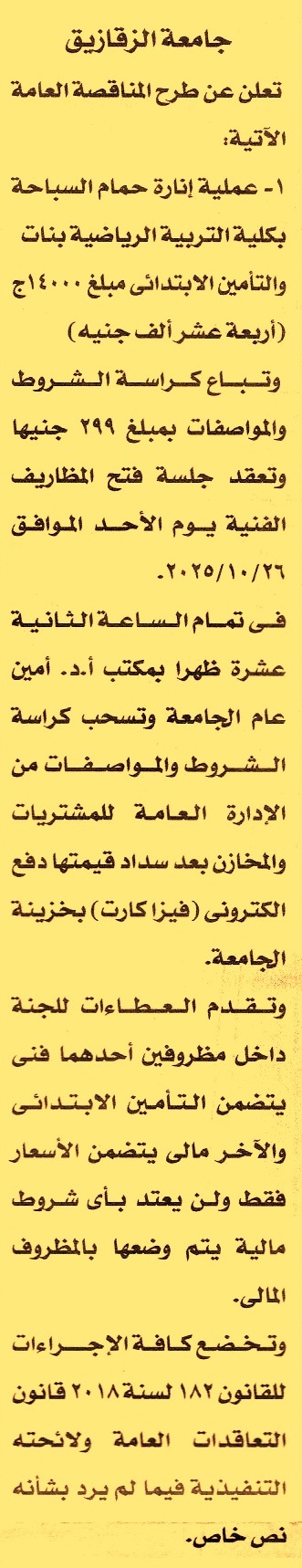 HOT information مناقصة عامة لعملية إنارة حمام السباحة بكلية التربية الرياضية بنات عن جريدة الأخبار Post navigation شركة مياه الشرب والصرف الصحي بالجيزة نادي بنها الرياضي
