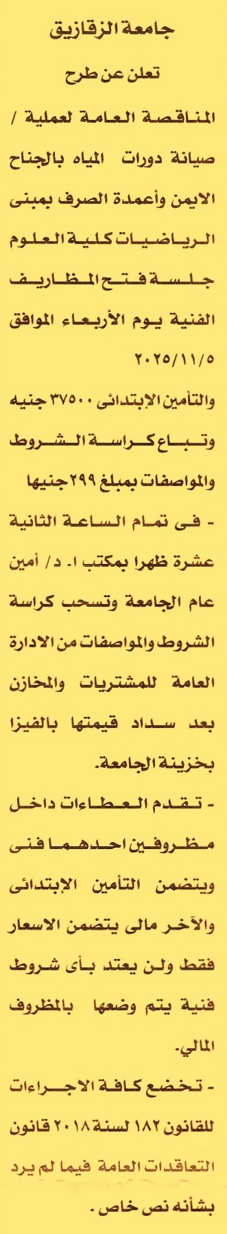 HOT information مناقصة عامة لعملية صيانة دورات المياه بالجناح الأيمن وأعمدة الصرف بمبنى الرياضيات كلية العلوم عن جريدة الأخبار Post navigation شركة جنوب القاهرة لتوزيع الكهرباء مستشفيات جامعة المنوفية