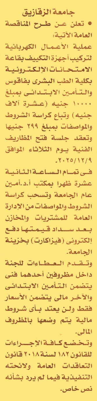 HOT Information مناقصة عامة لعملية تنفيذ الأعمال الكهربائية لتركيب أجهزة التكييف بقاعة الامتحانات الإلكترونية بكلية الطب البشري بفاقوس عن جريدة الأخبار Post navigation وزارة الموارد المائية والري الوحدة المحلية لمركز ومدينة أخميم