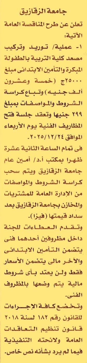 HOT Information مناقصة عامة لعملية توريد وتركيب مصعد كلية التربية بالطفولة المبكرة عن جريدة الأخبار Post navigation نادي حلوان الرياضي مركز مارينا العلمين السياحي