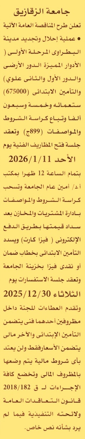 HOT information مناقصة عامة لعملية إحلال وتجديد مدينة البطراوي المرحلة الأولى “الأدوار المميزة الدور الأرضي والدور الأول والثاني علوي” (جلسة الاستفسارات يوم 30/12/2025) عن جريدة الأهرام Post navigation مستشفى سامول المركزي شركة مطاحن مصر الوسطى