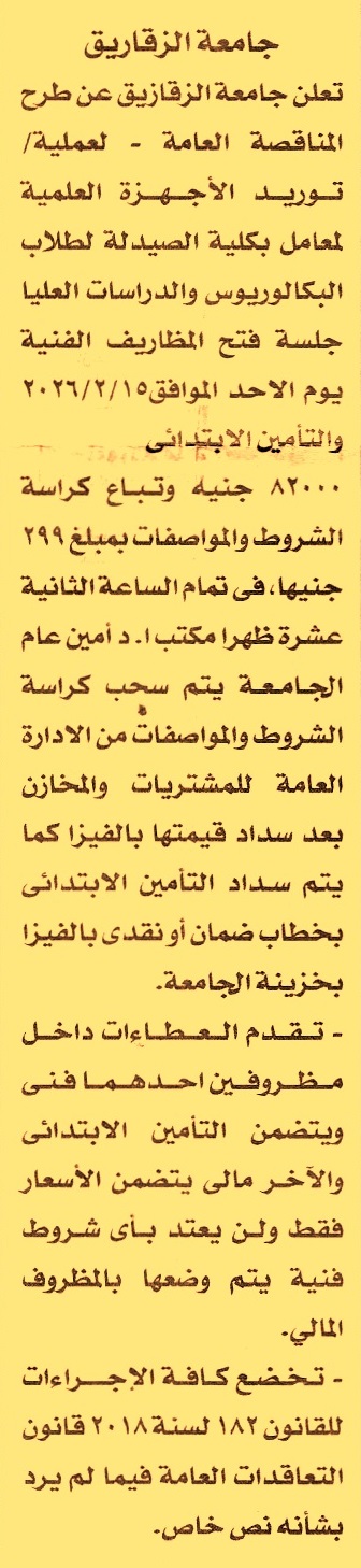 HOT Information مناقصة عامة لعملية توريد الأجهزة العلمية لمعامل بكلية الصيدلة لطلاب البكالوريوس والدراسات العليا عن جريدة الأخبار Post navigation مركز شباب مدينة الشهداء محافظة بني سويف