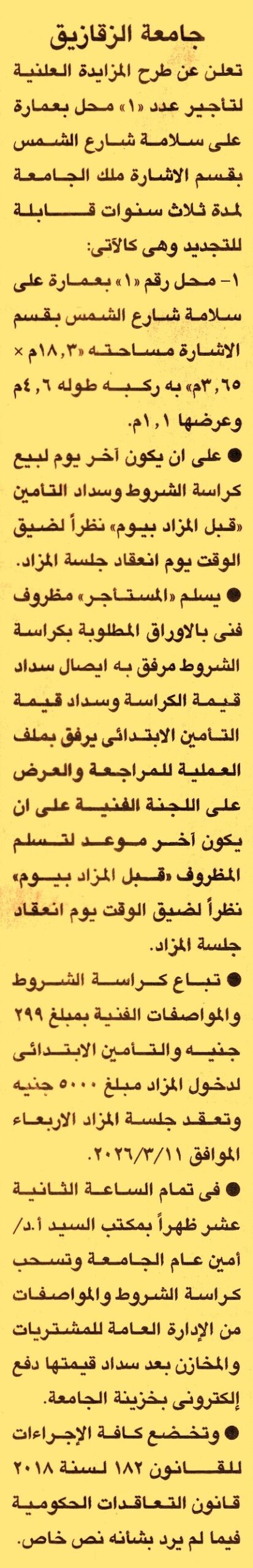 HOT information مزايدة علنية لعملية تأجير عدد 1 محل بمساحة 18.3م×3.65م به ركبه طوله 4.6م وعرضه 1.1م بعمارة علي سلامة بشارع الشمس – قسم الإشارة لمدة 3 سنوات قابلة للتجديد عن جريدة الجمهورية Post navigation مركز التنمية الشبابية بمدينة تلا بالمنوفية نادي جزيرة الورد الرياضي بالمنصورة