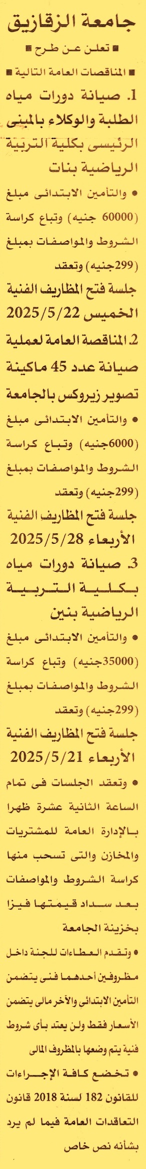 HOT Information مناقصة عامة لعملية صيانة دورات مياه الطلبة والوكلاء بالمبنى الرئيسي بكلية التربية الرياضية بنات عن جريدة الأهرام Post navigation شركة مياه الشرب والصرف الصحي بالقليوبية مكتب النائب العام