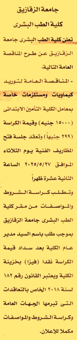 HOT Information مناقصة عامة لعملية توريد كيماويات ومستلزمات خاصة بمعامل الكلية عن جريدة الأخبار Post navigation البنك العقاري المصري العربي الإدارة العامة لصرف شرق المنوفية