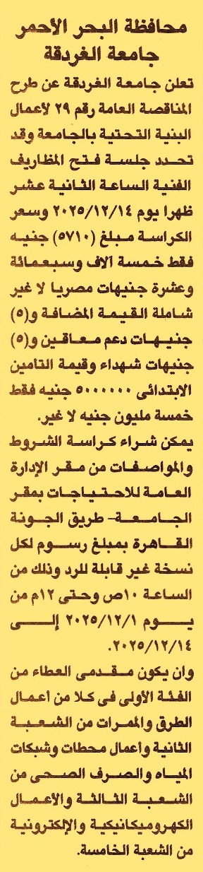 HOT Information مناقصة عامة رقم 29 لعملية تنفيذ أعمال البنية التحتية بالجامعة (فئة التصنيف الأولى شعبة أعمال طرق وممرات وأعمال محطات وشبكات المياه والصرف الصحي وأعمال كهروميكانيكية والكترونية) عن جريدة الجمهورية Post navigation شركة مياه الشرب والصرف الصحي بالدقهلية مجلس مدينة نخل