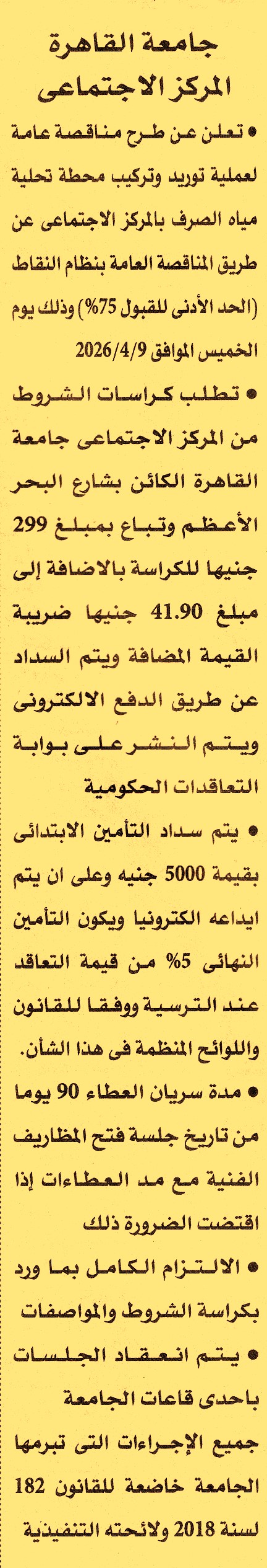 HOT information مناقصة عامة لعملية توريد وتركيب محطة تحلية مياه الصرف بالمركز الاجتماعي (العملية بنظام النقاط بحد أدنى للقبول 75% ومدة سريان العطاءات 3 أشهر) عن جريدة الأهرام Post navigation مديرية الشئون الصحية بالغربية شركة مطاحن مصر الوسطى