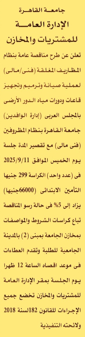 HOT Information مناقصة عامة لعملية صيانة وترميم وتجهيز قاعات ودورات مياه الدور الأرضي بالمجلس العربي “إدارة الوافدين” جامعة القاهرة عن جريدة الأهرام Post navigation مركز شباب عزبة ذكي جهاز تنمية مدينة القاهرة الجديدة