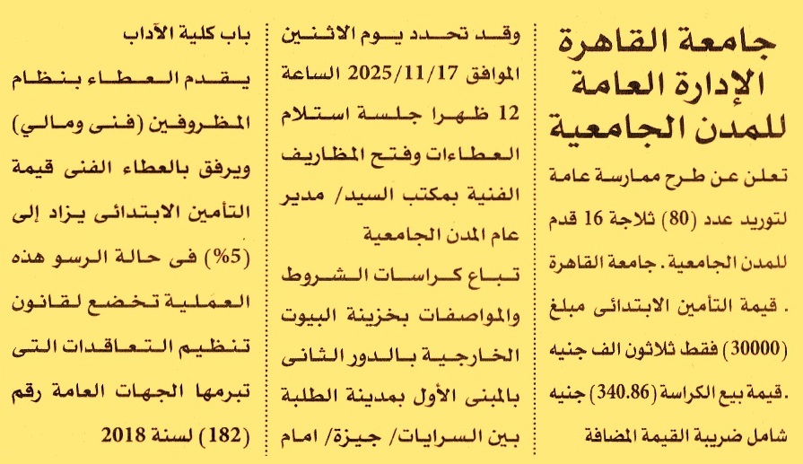 HOT Information ممارسة عامة لعملية توريد عدد 80 ثلاجة 16 قدم للمدن الجامعية عن جريدة الأهرام Post navigation الشركة المصرية لتجارة الأدوية شركة مياه الشرب والصرف الصحي بالغربية