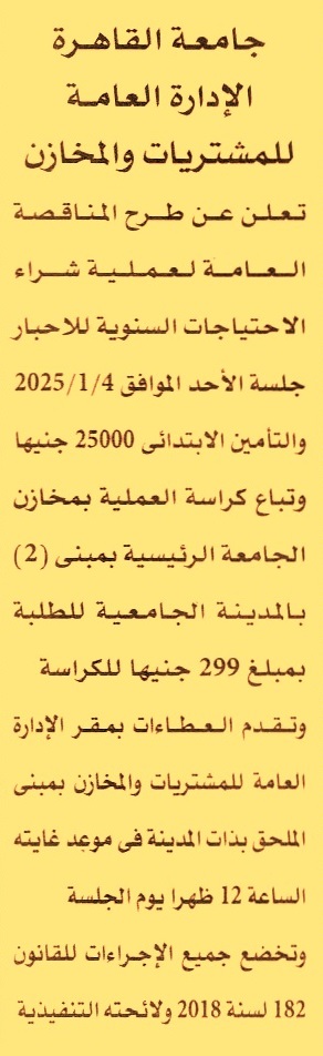 HOT information مناقصة عامة لعملية توريد الاحتياجات السنوية من الأحبار عن جريدة الأهرام Post navigation الشركة المصرية لتجارة الجملة وكالة أنباء الشرق الأوسط