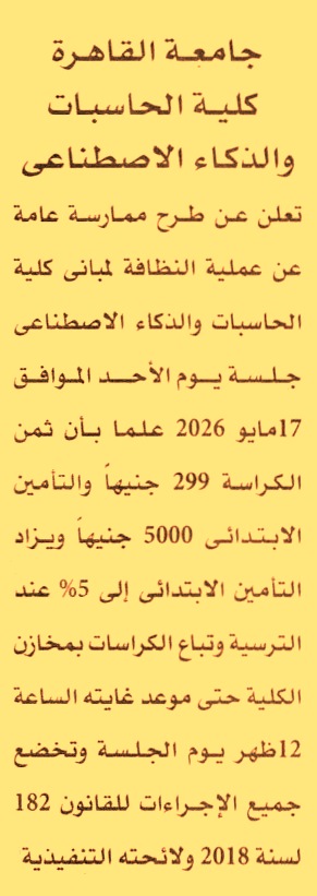 HOT information مناقصة عامة لعملية تنفيذ أعمال النظافة لمباني كلية الحاسبات والذكاء الاصطناعي عن جريدة الأهرام Post navigation الهيئة العامة للتنمية السياحية شركة مصر العامرية للغزل والنسيج