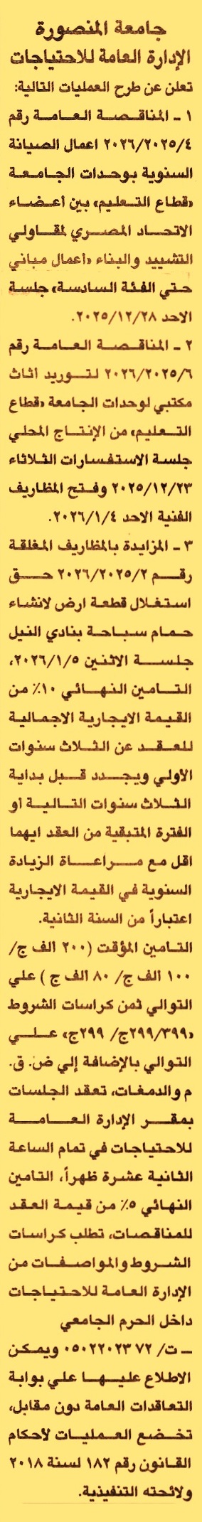 HOT Information مناقصة عامة رقم 4/2025/2026 لعملية تنفيذ أعمال الصيانة السنوية بوحدات الجامعة “قطاع التعليم” (فئة التصنيف السادسة شعبة أعمال مباني) عن جريدة الجمهورية Post navigation جمعية مستشفى الأنجلو أمريكان مركز التنمية الشبابية بالفرستق