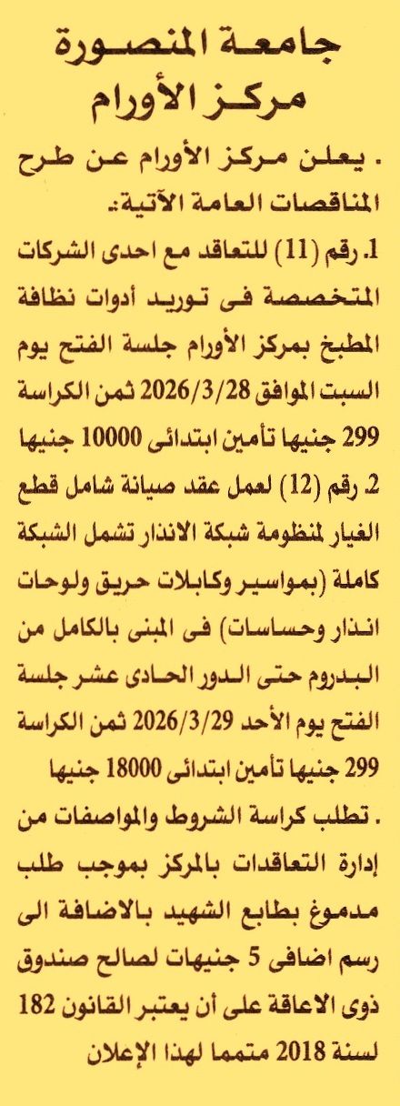 HOT information مناقصة عامة رقم 11/2025/2026 لعملية توريد أدوات نظافة المطبخ بمركز الأورام عن جريدة الأهرام Post navigation جامعة القاهرة الإدارة العامة لري قناطر الدلتا