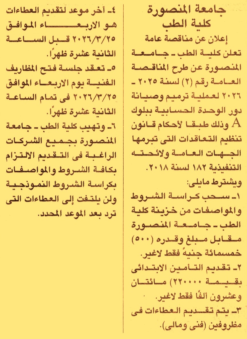 HOT information مناقصة عامة رقم 2/2025/2026 لعملية ترميم وصيانة دور الوحدة الحسابية ببلوك A عن جريدة الجمهورية Post navigation الخبير المثمن/ مجدي زكي عجايبي جامعة دمياط