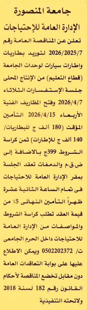 HOT Information مناقصة عامة رقم 7/2025/2026 لعملية توريد الأتي (1) بطاريات (2) إطارات سيارات لوحدات الجامعة “قطاع التعليم” من الإنتاج المحلي (جلسة الاستفسارات يوم 7/4/2026) عن جريدة الأهرام Post navigation شركة مياه الشرب والصرف الصحي بمحافظات القناة جامعة طنطا