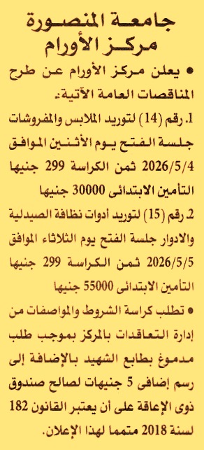 HOT information مناقصة عامة رقم 14/2025/2026 لعملية توريد الملابس والمفروشات عن جريدة الأهرام Post navigation وزارة التربية والتعليم والتعليم الفني شركة شمال القاهرة لتوزيع الكهرباء