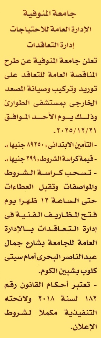 HOT Information مناقصة عامة لعملية توريد وتركيب وصيانة المصعد الخارجي بمستشفى الطوارئ عن جريدة الأخبار Post navigation محافظة سوهاج نادي زمالك قلين الرياضي