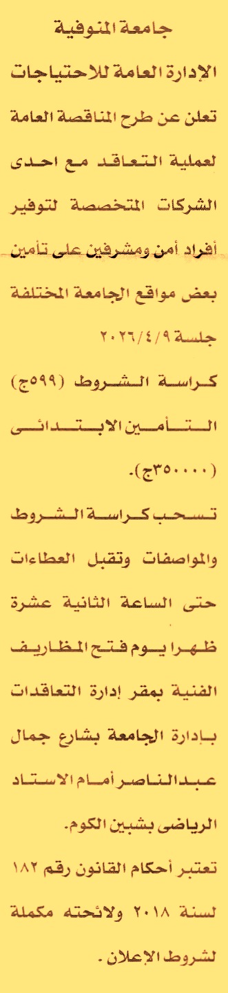 HOT information مناقصة عامة لعملية توفير أفراد أمن ومشرفين على تأمين بعض مواقع الجامعة المختلفة عن جريدة الأخبار Post navigation جامعة قنا شركة النيل العامة للإنشاء والطرق