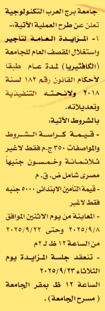 HOT Information مزايدة عامة لعملية تأجير واستغلال المقصف العام للجامعة “الكافتيريا” لمدة عام (أخر موعد للمعاينة يوم 22/9/2025 من الساعة 12 ظ حتى 2 ظ) عن جريدة الأخبار Post navigation الوكالة الإيطالية من أجل التنمية بالقاهرة شركة النصر لصناعة المطروقات