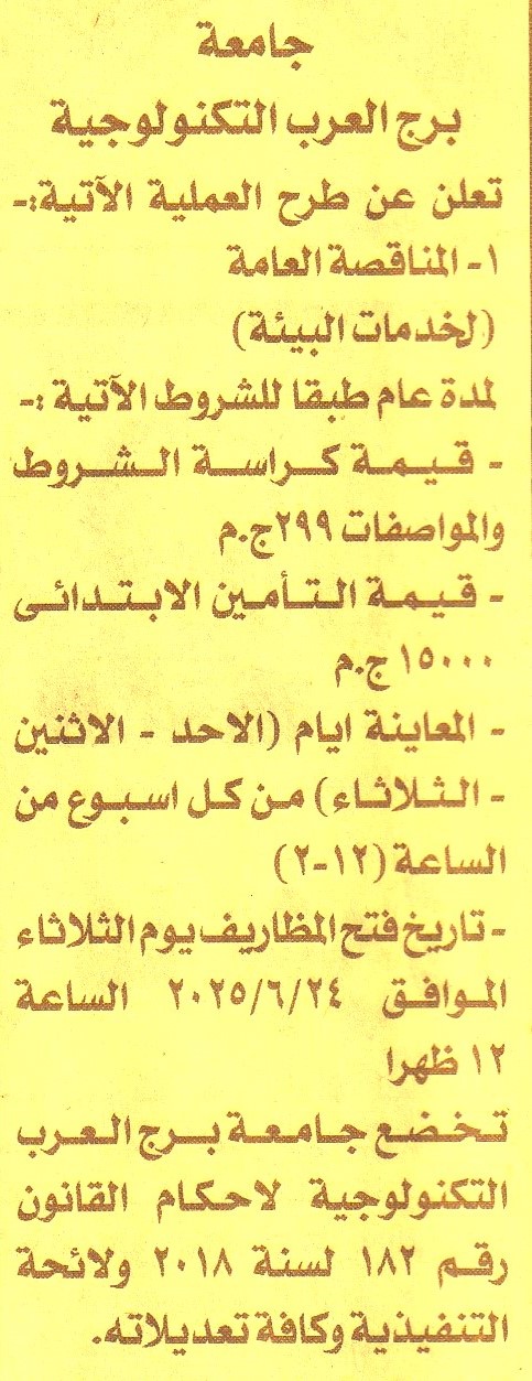 HOT Information مناقصة عامة لعملية تقديم الخدمات البيئية لمدة عام (المعاينة أيام الأحد والإثنين والثلاثاء من كل أسبوع من الساعة 12 ظ حتى 2 ظ) عن جريدة الأخبار Post navigation البنك العقاري المصري العربي بنك أبو ظبي الأول مصر
