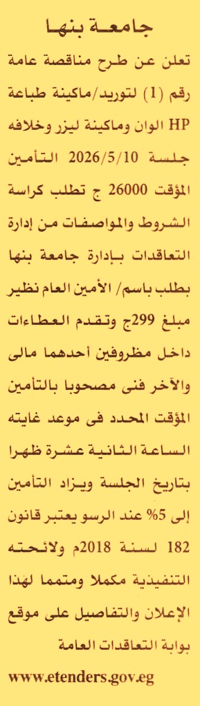 HOT Information مناقصة عامة رقم 1 لعملية توريد ماكينة طباعة HP والأوان وماكينة ليزر وخلافه عن جريدة الأهرام Post navigation قرية اللوتس بالساحل الشمالي شركة الخدمات التجارية البترولية