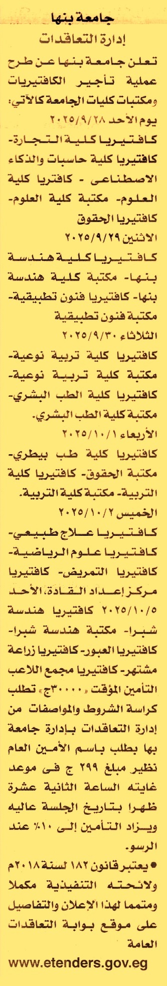 HOT Information مزايدة عامة لعملية تأجير كافتيريات ومكتبات كليات الجامعة “كافتيريا كلية التجارة, كافتيري اكلية حاسبات والذكاء الاصطناعي, كافتريا كلية العلوم, مكتبة كلية العلوم, كافتيريا الحقوق” عن جريدة الأخبار Post navigation نادي هليوبوليس الرياضي رئاسة مركز ومدينة كفر صقر