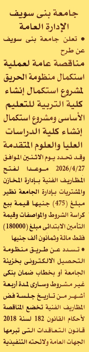 HOT Information مناقصة عامة لعملية استكمال منظومة الحريق لمشروع استكمال إنشاء كلية التربية للتعليم الأساسي ومشروع استكمال إنشاء كلية الدراسات العليا والعلوم المتقدمة (مدة سريان خطاب الضمان 4 أشهر) عن جريدة الأهرام Post navigation شركة مياه الشرب والصرف الصحي ببني سويف الجمعية الطبية الإسلامية