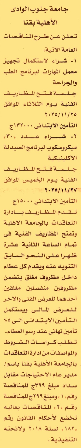 HOT Information مناقصة عامة لعملية استكمال تجهيز معمل المهارات لبرنامج الطب والجراحة عن جريدة الأخبار Post navigation الهيئة القومية للبريد وزارة التربية والتعليم والتعليم الفني