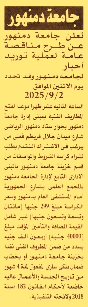 HOT Information مناقصة عامة لعملية توريد أحبار (مدة سريان خطاب الضمان 4 أشهر) عن جريدة الأهرام Post navigation مركز التنمية الشبابية بمغاغة بالمنيا الادارة العامة لمشروعات تطوير الري بوسط الدلتا