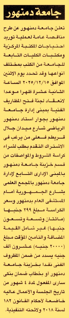 HOT Information مناقصة عامة لعملية توريد احتياجات المكتبة المركزية ومكتبات الكليات التابعة للجامعة من الكتب بمختلف أنواعها (مدة سريان خطاب الضمان 4 أشهر) عن جريدة الجمهورية Post navigation شركة ميناء القاهرة الجوي جامعة الأزهر