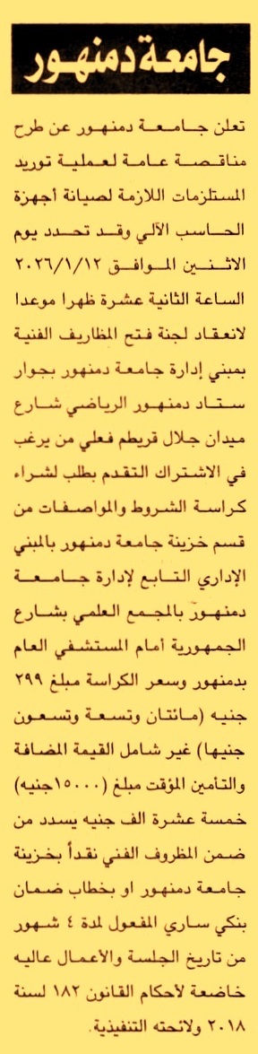 HOT Information مناقصة عامة لعملية توريد المستلزمات اللازمة لصيانة أجهزة الحاسب الألي (مدة سريان خطاب الضمان 4 أشهر) عن جريدة الجمهورية Post navigation شركة مصر للبترول مركز شباب الحرمين
