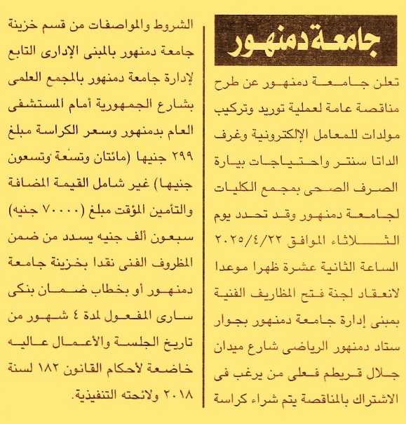 HOT Information مناقصة عامة لعملية توريد وتركيب مولدات للمعامل الإلكترونية وغرف الداتا سنتر واحتياجات بيارة الصرف الصحي بمجمع الكليات لجامعة دمنهور (خطاب ضمان ساري المفعول لمدة 4 شهور) عن جريدة الجمهورية Post navigation شركة مياه الشرب والصرف الصحي بالمنيا الهيئة المصرية العامة للمعارض والمؤتمرات