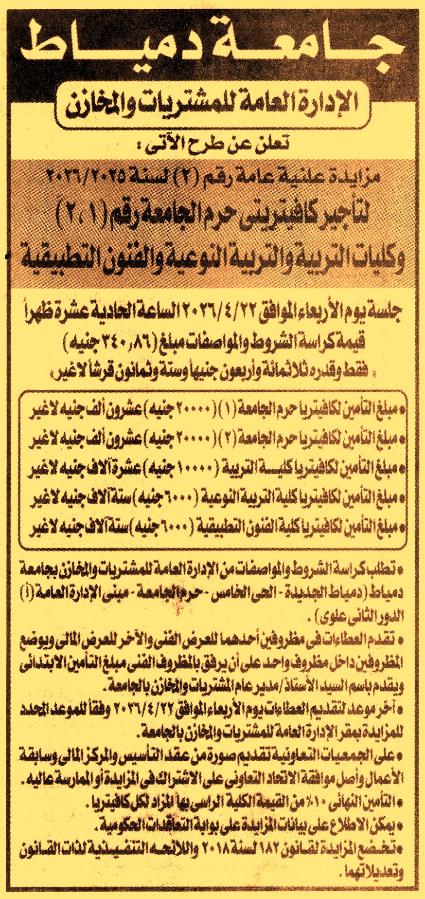تأجير كافتيريتي حرم الجامعة رقم 1, 2 وكليات التربية والتربية النوعية والفنون التطبيقية