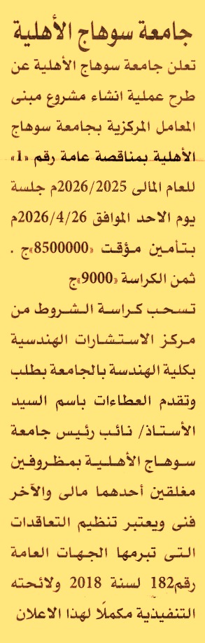 HOT information مناقصة عامة رقم 1/2025/2026 لعملية إنشاء مشروع مبنى المعامل المركزية بالجامعة عن جريدة الأهرام Post navigation جامعة سوهاج الوكالة الإيطالية للتعاون من أجل التنمية بالقاهرة