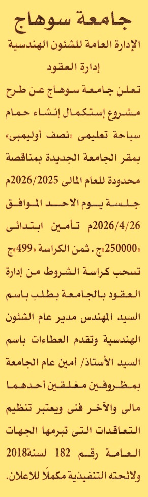 HOT information مناقصة عامة لعملية استكمال إنشاء حمام سباحة تعليمي “نصف أوليمبي” بمقر الجامعة الجديدة عن جريدة الأهرام Post navigation جامعة سوهاج جامعة سوهاج الأهلية