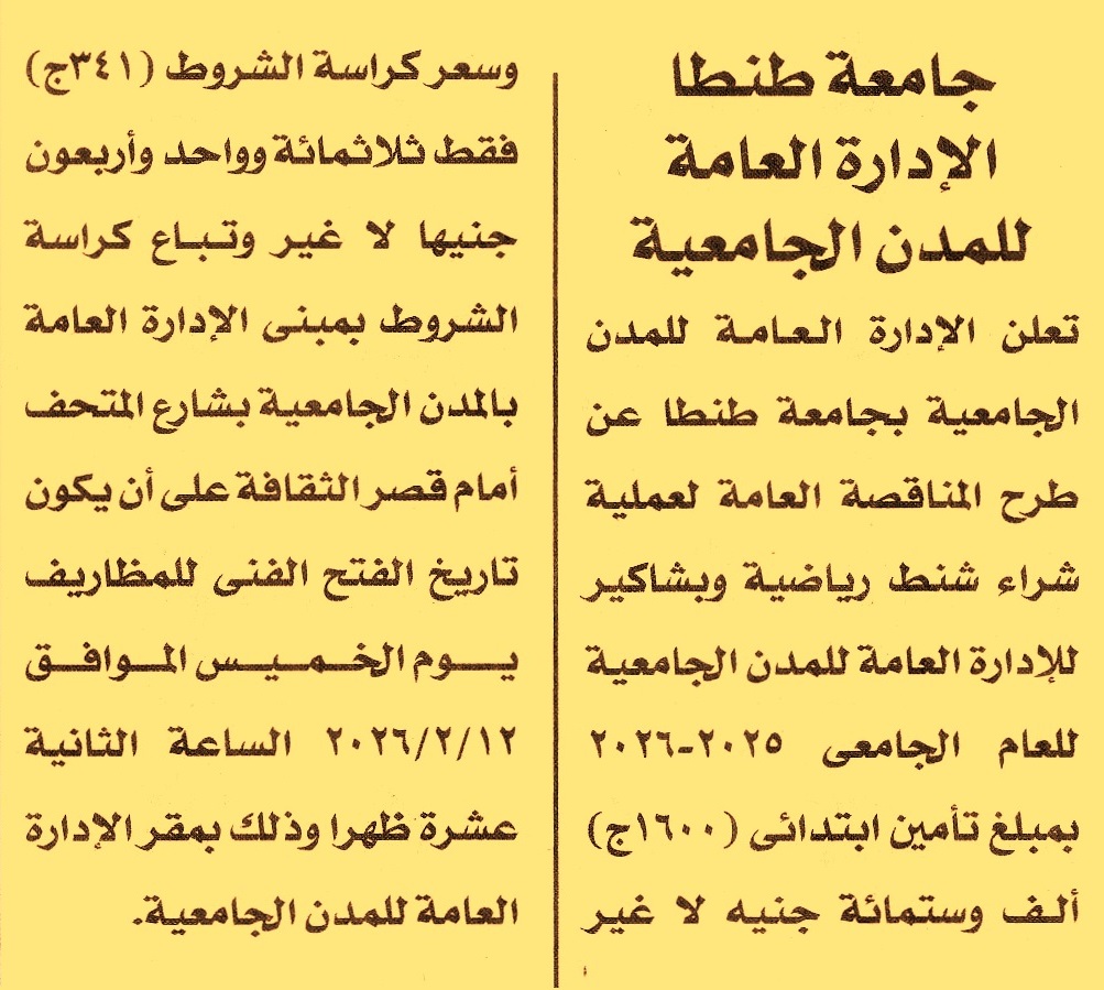 HOT information مناقصة عامة لعملية توريد شنط رياضية وبشاكير للإدارة العامة للمدن الجامعية عن جريدة الأخبار Post navigation الشركة العامة للأبحاث والمياه الجوفية “ريجوا” شركة مصر شبين الكوم للغزل والنسيج