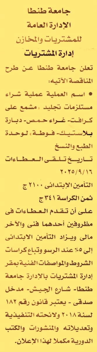 HOT Information مناقصة عامة لعملية توريد مستلزمات تجليد “مشمع على كرافت, غراء حمص, دبارة بلاستيك, فوطة” لوحدة الطبع والنسخ عن جريدة الأخبار Post navigation مركز التنمية الشبابية بالتجمع الأول بالقاهرة الجديد الهيئة العامة للإصلاح الزراعي