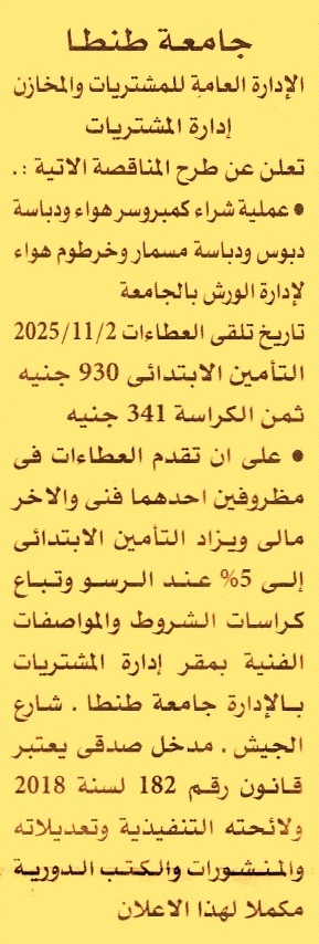 HOT Information مناقصة عامة لعملية توريد كمبروسر هواء ودباسة دبوس ودباسة مسامير وخرطوم هواء لإدارة الورش بالجامعة عن جريدة الأهرام Post navigation جامعة المنصورة الوحدة المحلية لمدينة الشلاتين