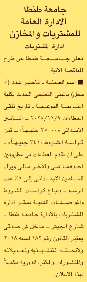 HOT Information مناقصة عامة لعملية تأجير عدد 5 محل بالمبنى التعليمي الجديد بكلية التربية النوعية عن جريدة الجمهورية Post navigation شركة الغازات البترولية مديرية الإسكان والمرافق بكفر الشيخ
