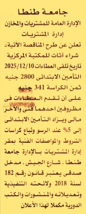 HOT Information مناقصة عامة لعملية توريد أثاث للمكتبة المركزية عن جريدة الأهرام Post navigation جامعة حلوان محافظة الغربية