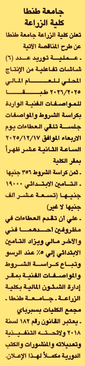 HOT Information مناقصة عامة لعملية توريد عدد 6 شاشات تفاعلية من الإنتاج المحلي عن جريدة الجمهورية Post navigation الهيئة القومية للبريد شركة مصر للبترول