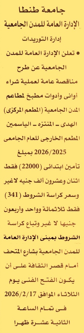 HOT Information مناقصة عامة لعملية توريد أواني وأدوات مطبع لمطاعم المدن الجامعية “المطعم المركزي” الهدى, المنتزه, الياسمين, المطعم الخارجي للعام الجامعي 2025/2026 عن جريدة الأهرام Post navigation شركة السكر والصناعات التكاملية المصرية الهيئة العامة لميناء الإسكندرية