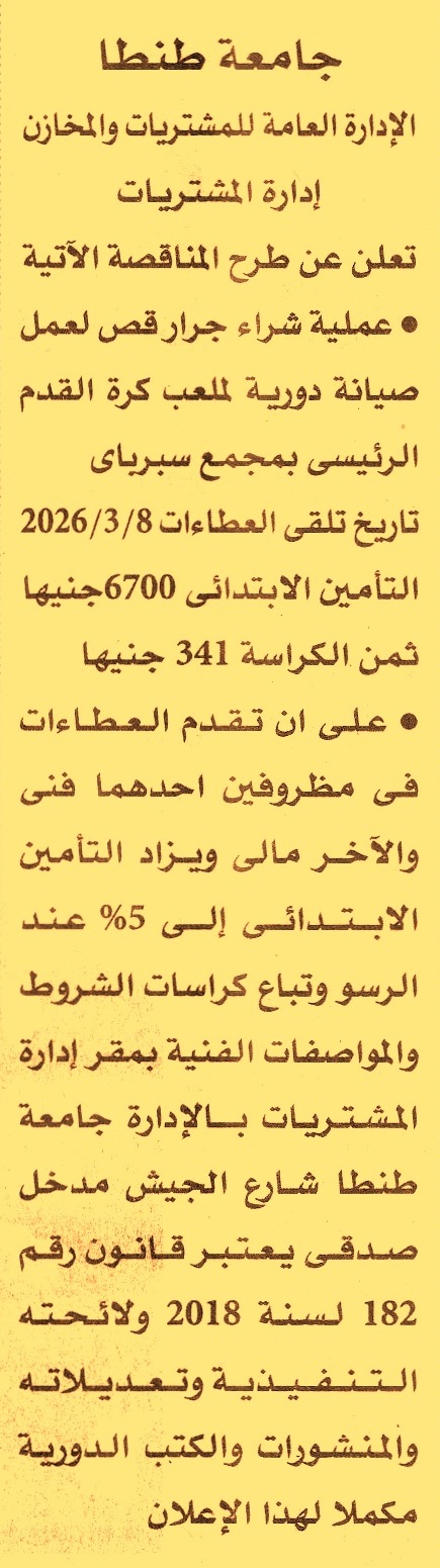 HOT Information مناقصة عامة لعملية توريد جرار قص لعمل صيانة دورية لملعب كرة القدم الرئيسي بمجمع سبرباي عن جريدة الأهرام Post navigation مصلحة الضرائب المصرية مركز شباب أسطال بالمنيا